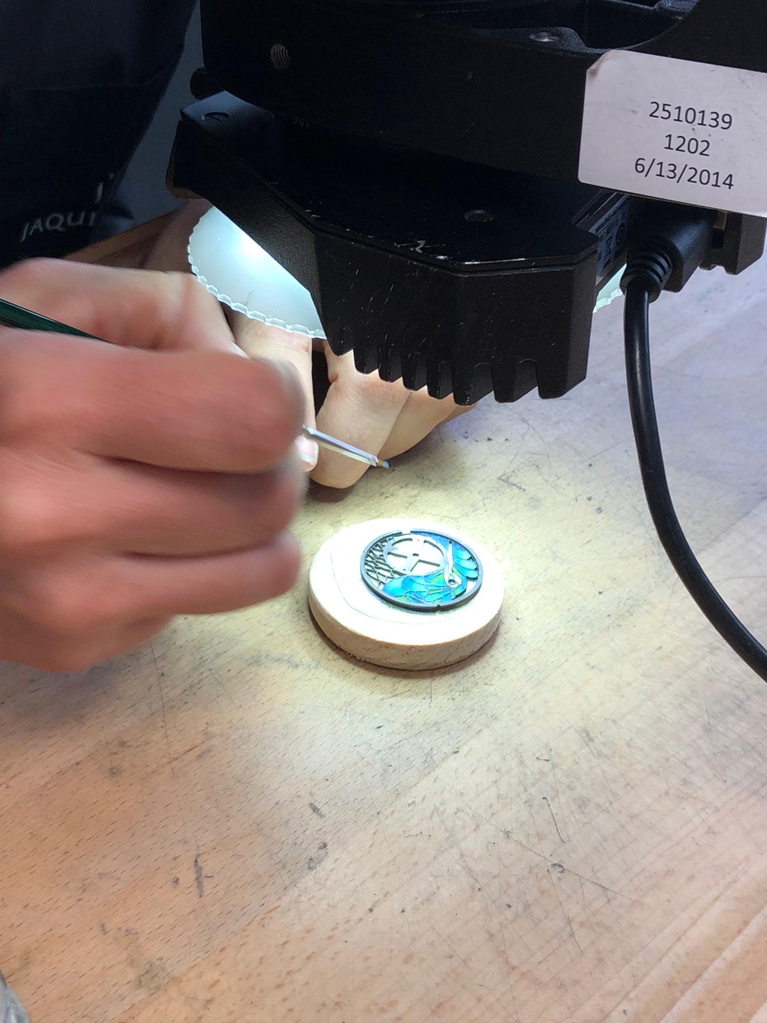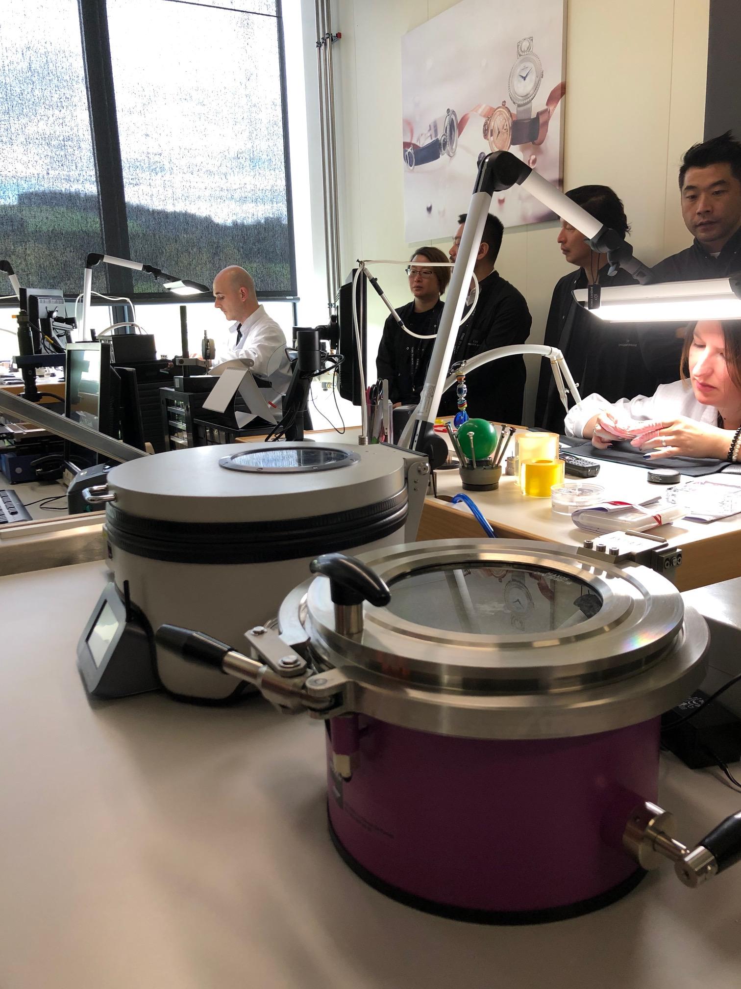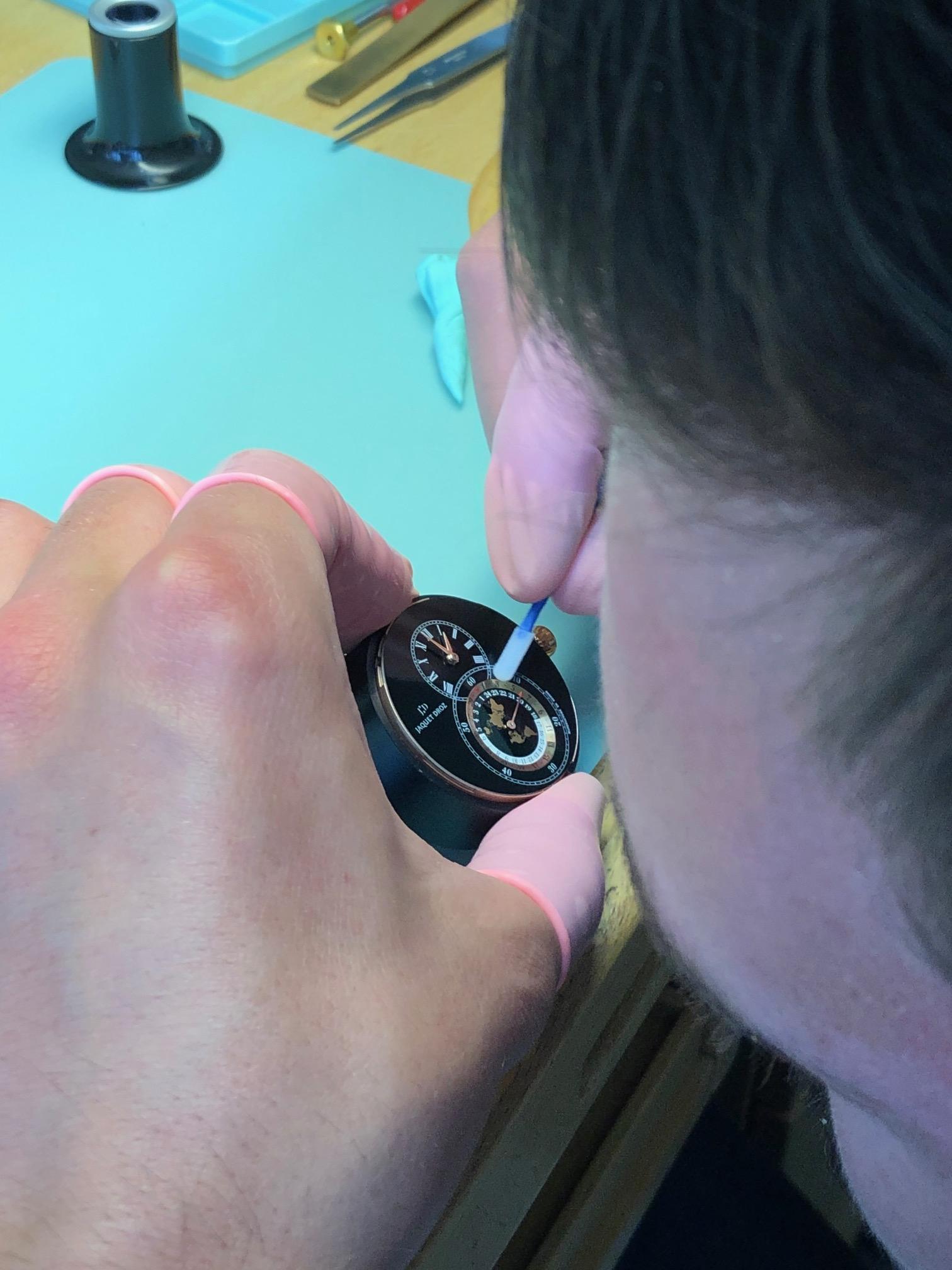 The watchmakers work in a positive pressure laminar box to ensure a dust free environment.